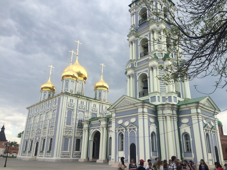 Потом мы сели в машину и поехали к Кремлю (Менделеевская 8). Вопреки информации с форумов, которых я начиталась перед поездкой, припарковались в 100 метрах от входа в Кремль. Зашли внутрь. Там площадка с чистыми свежими газонами, невысокими свежепосаженными деревцами, лавочками. На территории 2 храма - оба снаружи очень красивые, отреставрированные. Внутрь мы не заходили - Рома уже устал и требовал обед. Ниже краткая информация, которую я почерпнула в интернете перед поездкой.