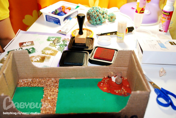 Делать пришлось почти ночью, так как с младшей сестренкой это не возможно. Итак, уложили Сашу спать, а сами с Егором принялись творить. Я вытащила из своего скрап-комода чернила, кракелюр, скотч и клей и работа началась!