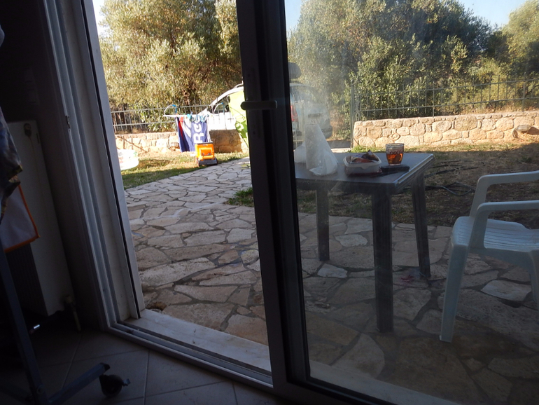 Квартира на первом этаже,с обратной стороны дома, со своим газоном и качелями во дворе. Соседка (на первом этаже с выходом во двор 2 квартиры) - гречанка, с двумя детьми 6 и 8 лет. Небольшой зал, совмещенный с кухней + 2 спальни + большой санузел с полноценной ванной. Стиральная машина, большой холодильник, вся необходимая мебель. Возможно комфортное размещение до 4 человек (больше принять не готова).