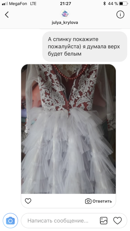 Перед выпускным дочки, искала в Инстограмм, где заказать платье! Так как в магазине ничего не подобрали, решили шить по индивидуальным меркам. Нужно было белое платье с красными деталями. (выпускной в бело-красном стиле). Наткнулась на страницу . Написала в директ 1 мая обо всем договорились, цена платья 9000 р. Попросила доставку за их счет, сразу согласились! Перевела деньги на карту. 16 мая пришло сообщение что платье готово, прислали фото, мне показалось оно не очень, написала об этом, мне в ответ сказали, что в живую на самом деле очень красивое. Перевела оставшуюся сумму. Вечером в пятницу забираю платье из СДЕК мне говорят оплатить доставку 636(первый обнаруженный обман), оплатила куда деваться, думая ладно напишу им. Вынимаю платье и просто слезы на глазах! При получении сразу обратила внимание на вес посылки почти 2 кг.