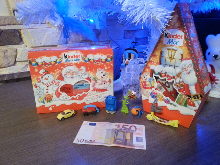 Ну а это подарочек мне от моего любимого мужа!!! Был он запакован очень оригинально, в красивой коробке. А внутри лежало 2 коробки киндеров и еще 6 киндер-сюрпризов, на фото правда от них остались только игрушки))) И денежка) При чем лежало 5 белых конвертов, которые были пронумерованы и в каждом лежала записка и небольшая денежка, а в итоге 50 евро!