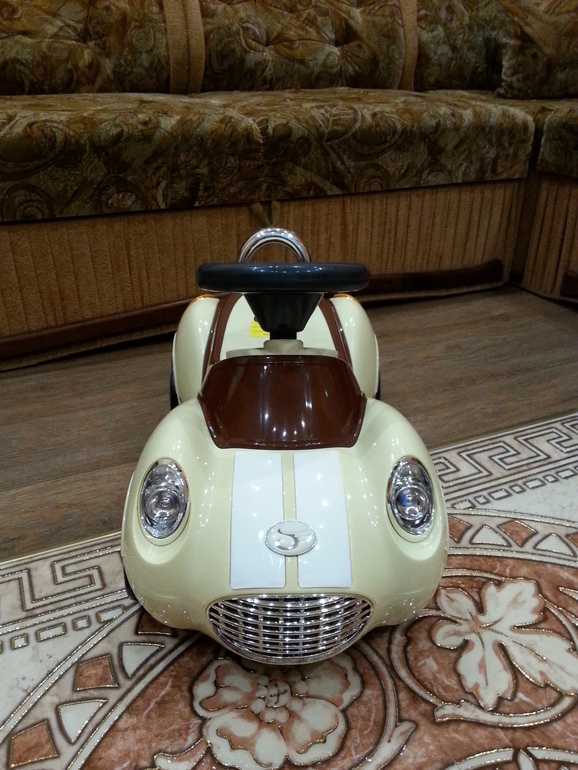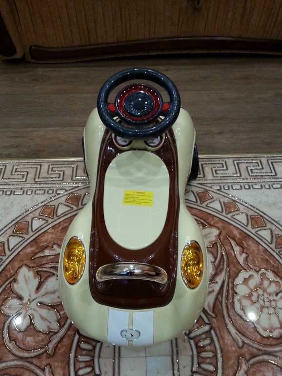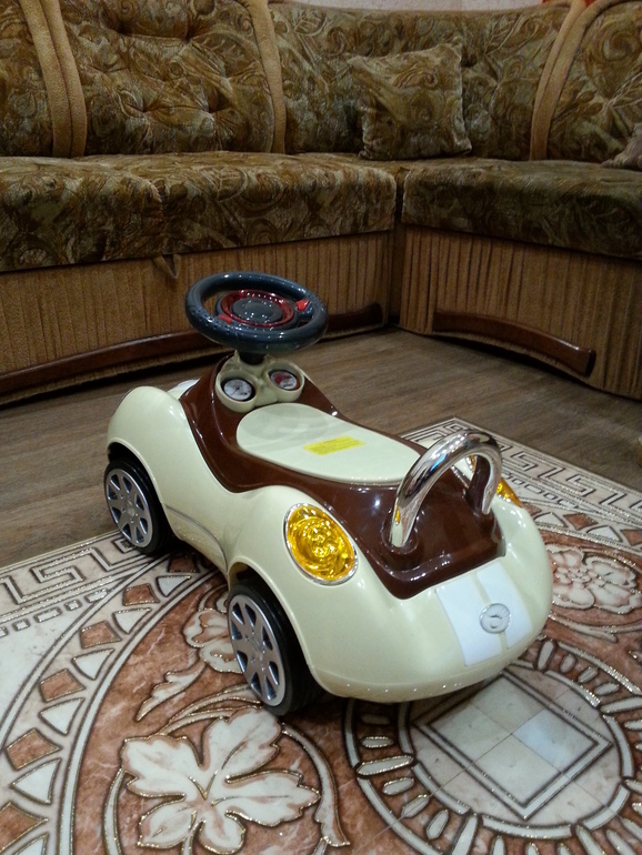 Гвоздь программы подаренная нами машина-каталка) Сынуля был в восторге!!! Сам на нее садится и пытается отталкиваться ножками) Или катает ее за заднюю ручку) На руле есть две кнопочки, одна издает звук сигнала, а на другой разные мелодии играют. Руль поворачивается и вместе с ним передние колеса. Сами колеса прорезиненные-это самое главное! Ездит почти бесшумно даже по ламинату и плитке!