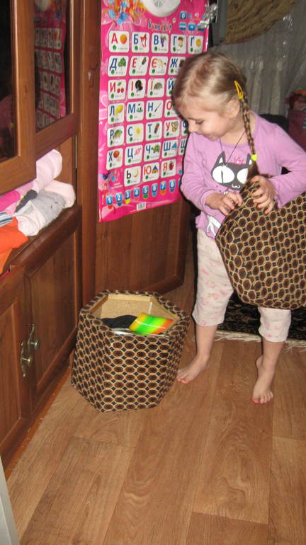 На фото, Аришка делает уборку своих игрушек и застилает коврик