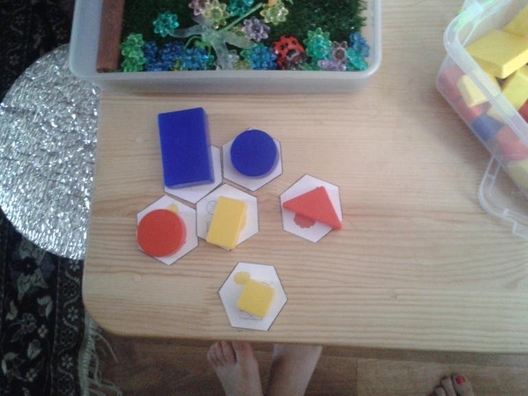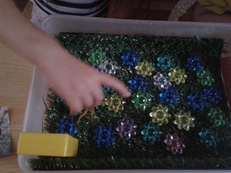Пчелка у нас очень веселая и задорная, поэтому она предложила отправится на прогулку по разноцветным цветочкам...Ариша очень точно повторяла мой маршрут)