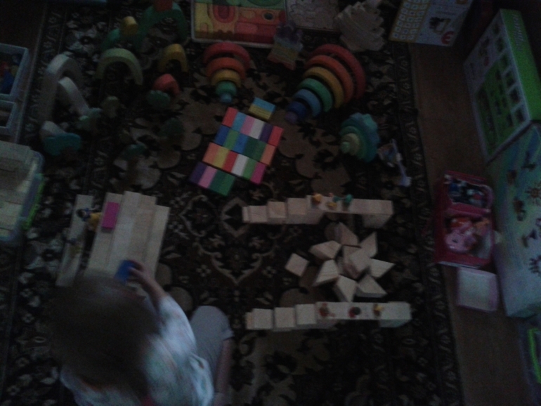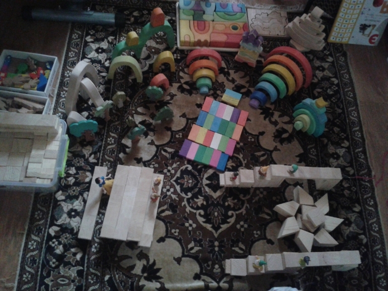 Играли мы долго и очень увлеченно....и пели и плясали и придумывали разные истории.....пока я не загадала Аришке, построить сказочную страну....и на этом желенании мы зависли до вечера....а точнее даже на два дня)))) Наш папа пополнил нам копилочку материалов для конструирования принеся много деревянных брусков разной формы и величины. Из них получился красивый стол и лавки, мосты, по которым гномы ходят на работу в лес....и т.д.