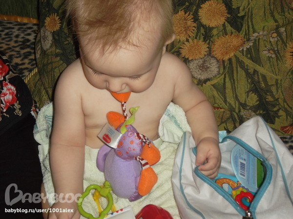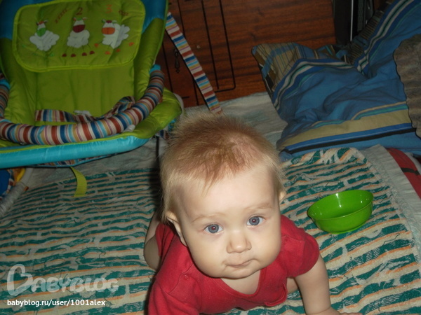 Ползаем (и довольно шустро), встаем возле любой опоры ( тренд сезона - отпускать руки) , главное встать и озарить всех своей беззубой улыбкой , болтает много, но на своем, даже не берусь переводить))). Любит целоваться и обниматься. Ввели прикорм, кушает - цв. капусту, брокалли, картошку, кабачек, яблоко, кашки гречневую и кукурузную. Любит компотик из яблок и смородины. Но самое главное блюдо - это сися. Без нее мы никуда))) (ттт) Зубов пока так и нет, но капризы стали чаше и вот уже вторую ночь просыпается каждый час, уже даже перестала пытаться переложить в кроватку. Сегодня были у врача, наш вес - 8500 (+400) и рост 69 (+1). Вроде ничего не забыла ( моя память это отдельная тема...) и фото: