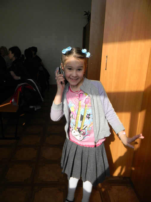 Вот моя кралечка после выступления, вся в образе гламурной дивчинки, нацепила сразу все подарки, которые её бабушка передала))