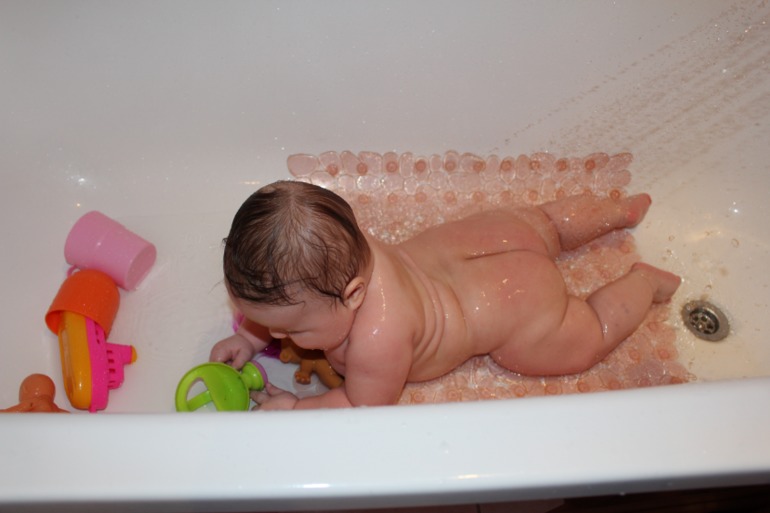 Папаня наш с превеликим удовольствием взялся за это дело)купать он любит дочек)значит так,в чем суть-на дно ванны стелим резиновый коврик и набираем водички ,чтобы не касалась подбородка,кладем на животик малыша и игрушек немного,сверху поливаем из душика-отличный массаж!Эми просто верещала от восторга)напарилась от души и развлеклась и не сложно было,а интересно!тем более,что в сидушке еще рано купать,пока не сидим,а в круге надоело(может,кто возьмет наш способ на заметку!очень рекомендую,мамочки попробовать)может кто уже так делал,напишите долго ли вы так купаетесь?)мы сегодня 20 мин кайфовали)