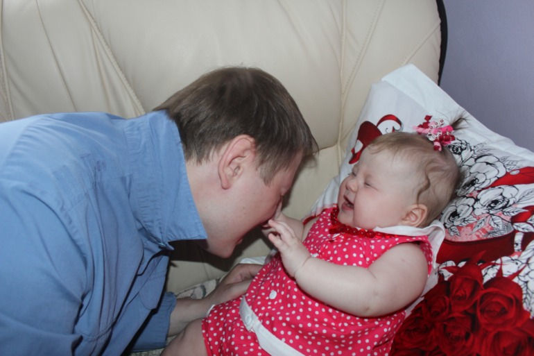 !!! Такая она улыбашка маленькая, так задорно смеется с папой!!! Прыческа ваша ваааще отпад, такой хвостик миленький))) А какая попка аппетитная, такие булочки румяные, ням-ням!!!! И про ванну, попробуем сёдня, как вы, идея - супер!!!! Спасибочки за подсказку, вроде и помылась красота, и наигралась, и впечатлений куча!!!