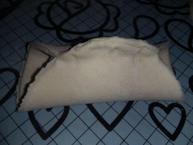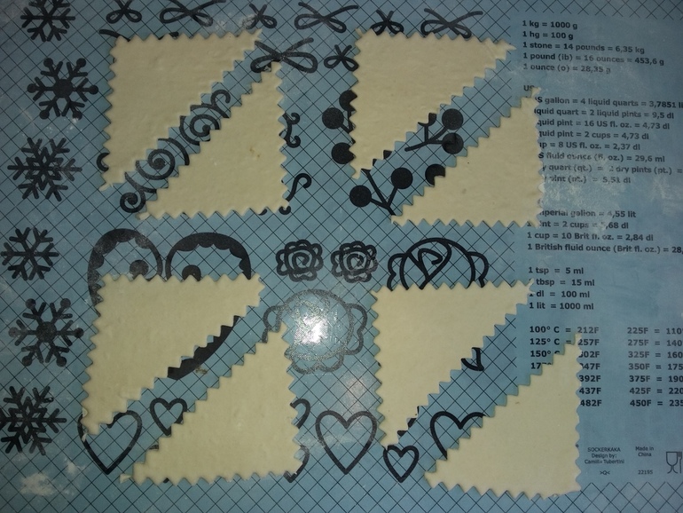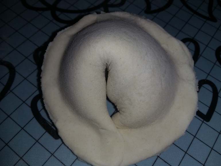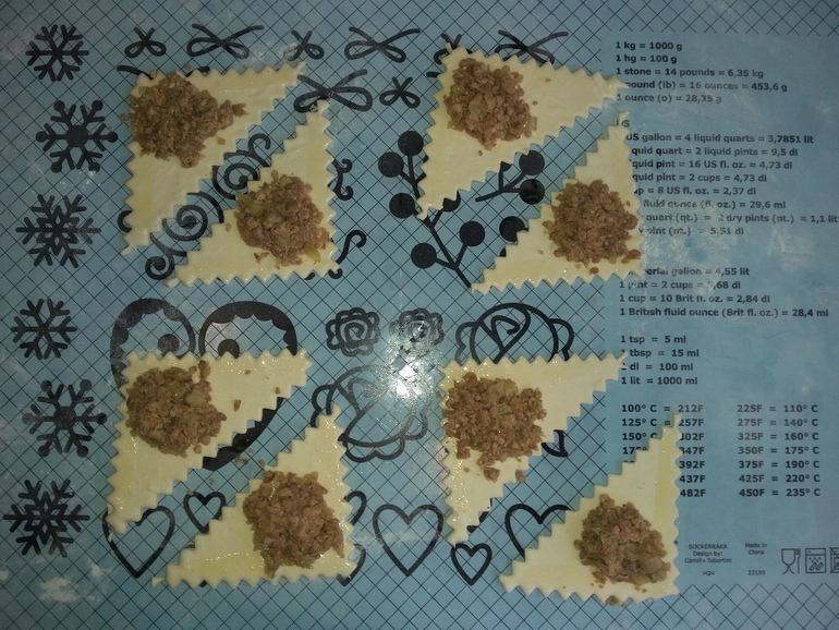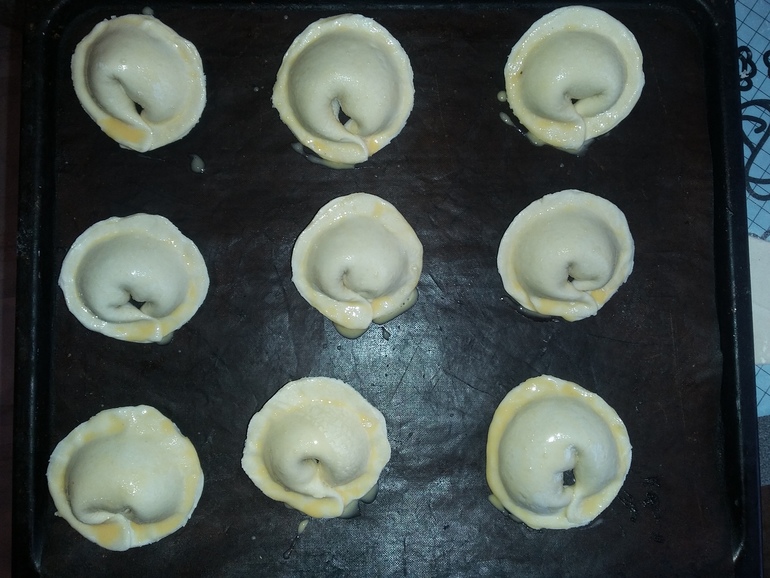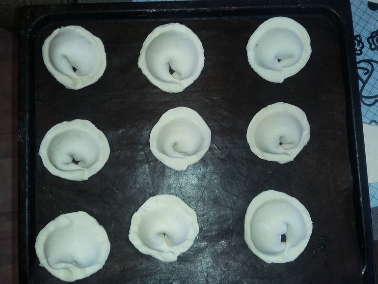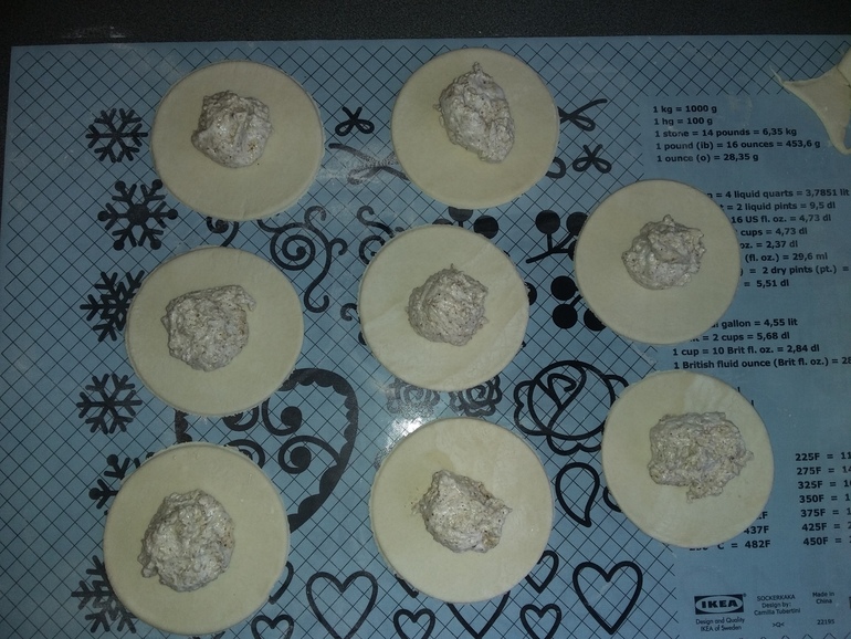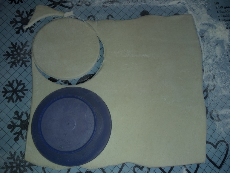 Пласт теста немного раскатать, чтобы можно было вырезать большие круги (я вырезаю миской 12 см):