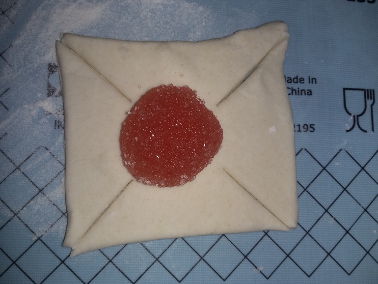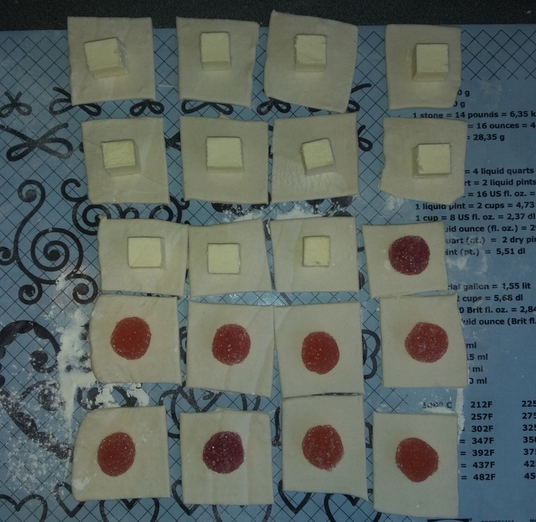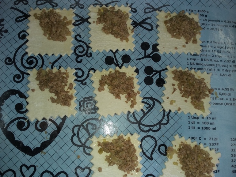 Квадраты слоеного теста немного раскатать, нарезать на квадратики со стороной 5-6 см: