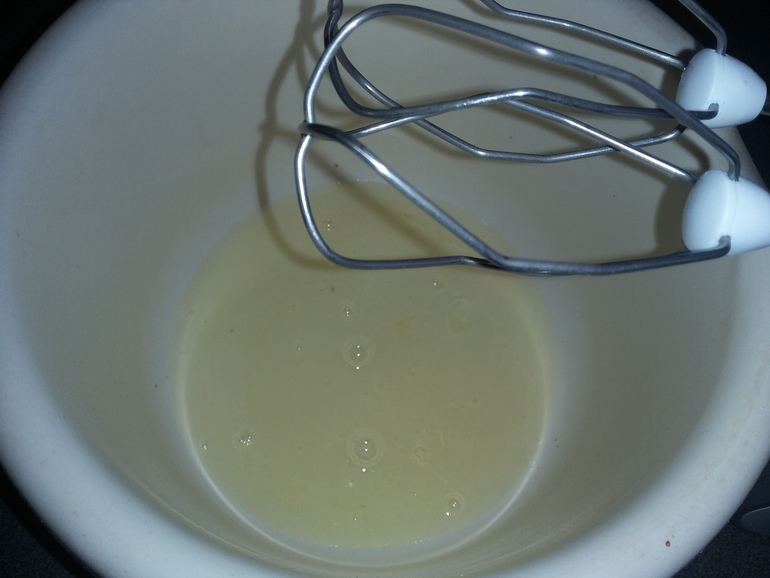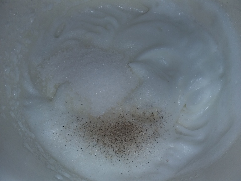 Взбить белки до крепких пиков, добавить ванилин и постепенно (взбивая) добавить стакан сахара: