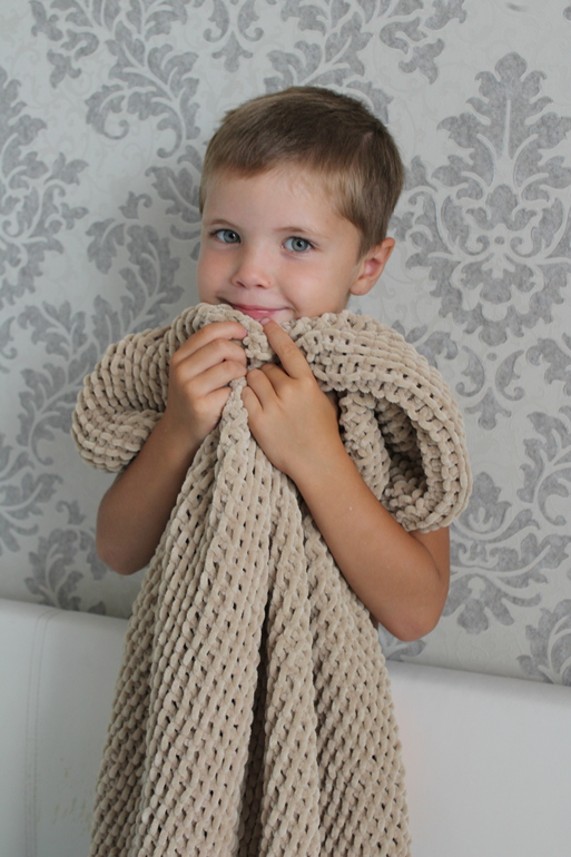 Связался вот такой пледик из плюшевой пряжи. Она оказалась немного капризной, несколько первых рядов казалось, что все вкривь и вкось, но потом случилась Любофф...
