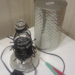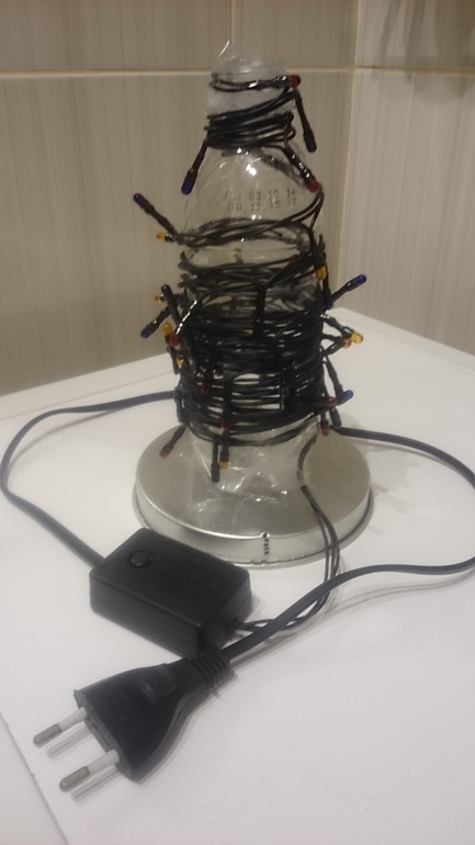 меняющая режимы елочная гирлянда, пластиковая бутылка помещающая в алюминиевую емкость, крышка от этой самой емкости и скотч. Делаем такую несложную конструкцию как на фото.