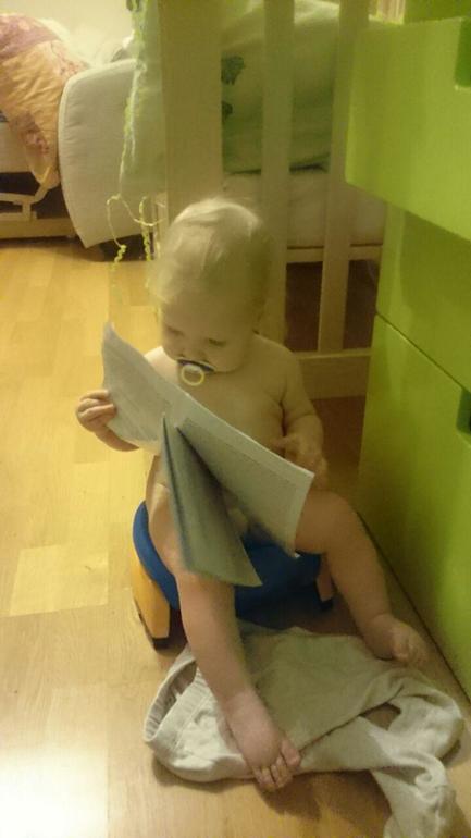 вот так дочь моя ходит на горшок, сидеть без книжек категорически отказывается. на фотографии она изучает брошюру по собственному кормлению, правильно ли я все делаю. да и у нас крутяцкий дорожный складной горшок с силиконовой вставкой и нам не будет проблем поехать к бабушке, икею, гости, сад и прочее, потому что у нас мега-горшок Potette