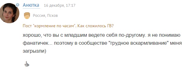 Скорее всего, мы с ней уже обсуждали идею кормления по часам, и я говорила о том, что это не способствует долгому и успешному ГВ. Ну и пометила себе, чтобы посмотреть, что будет. И вот пожалуйста - в сообществе ГВ сидят сумасшедшие злобные фанатки, у которых всё само собой получилось, а у ТС самые ужасные непреодолимые трудности, она изо всех сил боролась за ГВ, желала-желала, но в её ситуации это просто невозможно. А кормление по часам, конечно же, не является причиной лактостазов и перехода на ИВ.