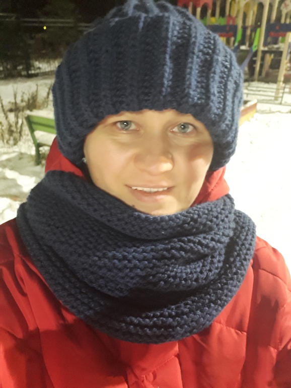 Я тут себе снуд с шапкой связала. Сын раскритиковал, а мне нравится, для прогулок с ребенком, по моему, ничего.