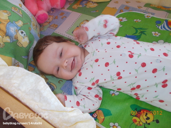 Взвесились-7100 гр, рост-62, Оголовы-42,5, Огруди - 44. Окулист снял с нас диагноз Дакриоцистит, пришлось делать зондирование, после него прошло 2 недели, глазки теперь у нас чистые и ясные. Сделали уже 3-е по счету УЗИ тазобедренных суставов, все хорошо, суставчики доразвились до нужного градуса (не без маминой помощи конечно, делали гимнастику), теперь можно идти со спокойной душой к ортопеду. НО есть одно НО, понижен уровень гемоглобина до 98, выписали Феррум Лек бесплатно по рецепту и на перездачу направили через неделю. Если все будет хорошо, то там и прививку поставят АКДС. Вот такие новости. А еще мы совсем перестали лежать, надо чтобы нас носили на руках и мы все разглядывали, самостоятельно перестал совсем засыпать с 3 месяцев, дольше укачиваешь его, чем он потом спит. Очень интересуемся своими пальчиками, все время их перебираем, а еще стали погремухи пробовать на зуб)))