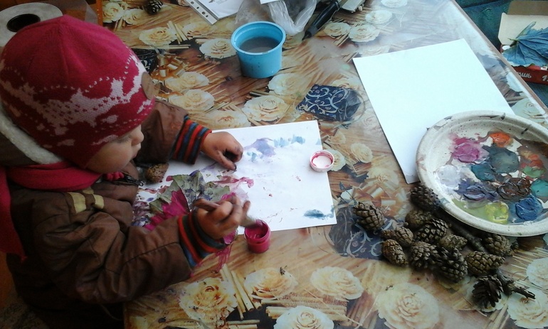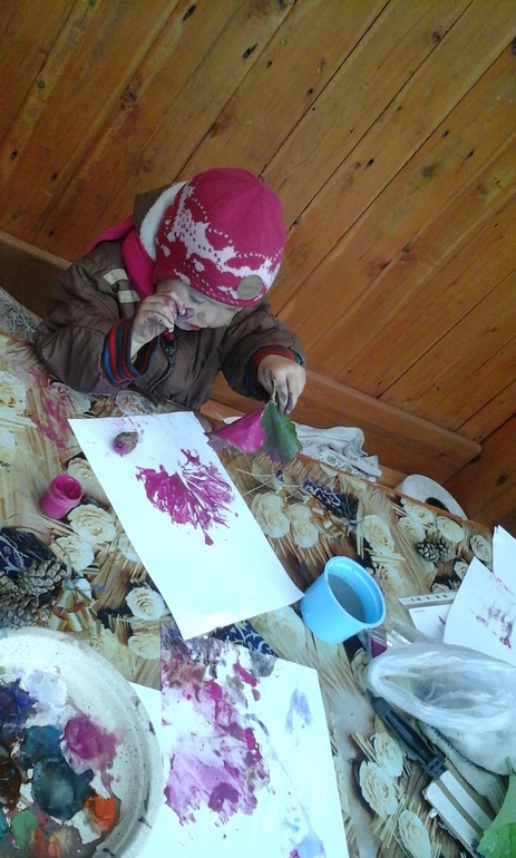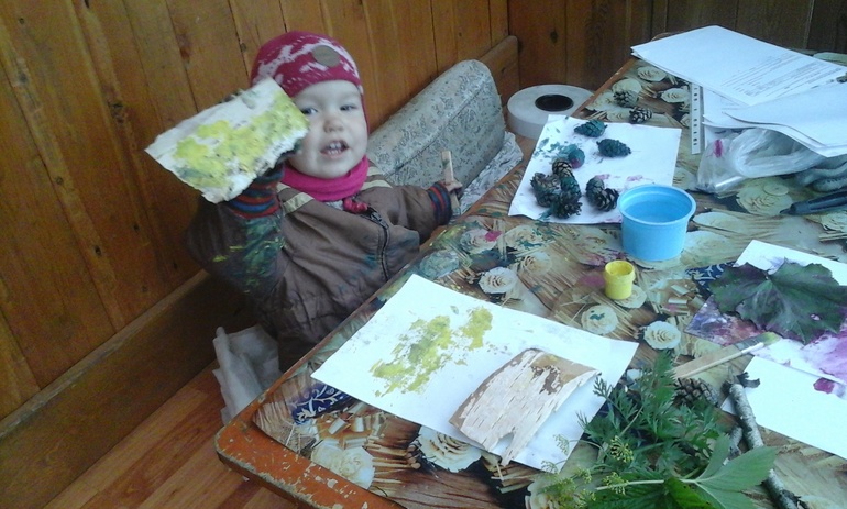 Еще с удовольствием делали отпечатки на листе: лопуха, шишки, коры от берёзы, веточек разных размеров.