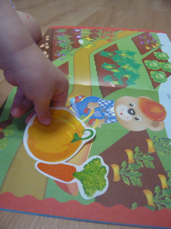 А вот с "живой грядкой" мы поиграли. Мне самой понравилось. Правда у нас овощи выросли разного размера :-). Те которые покрупнее овощи связала тётушка, а что поменьше я сшила сама (не судите строго :-)).