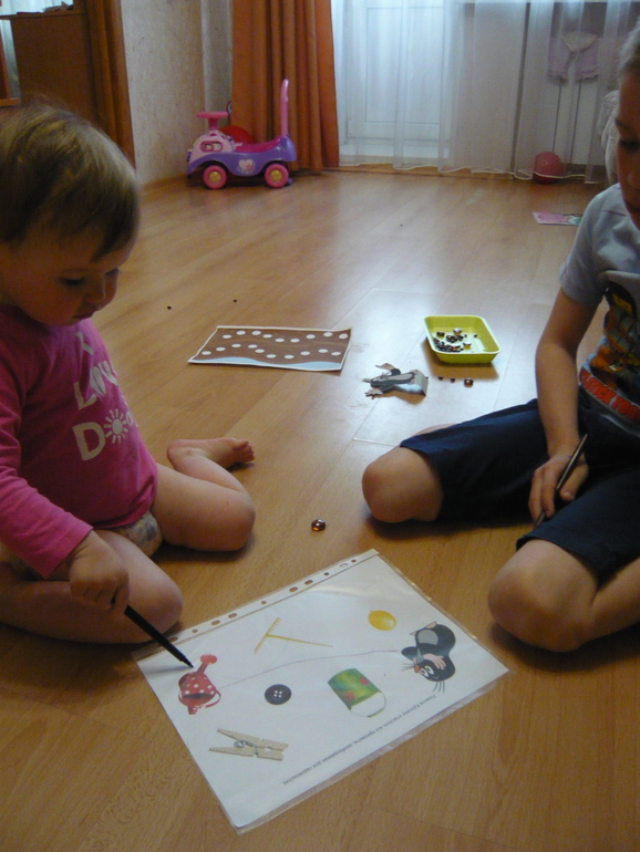 И задание с ушками зайчиков тоже вместе. Анфиса прикладывала ушки, Арсений поправлял.