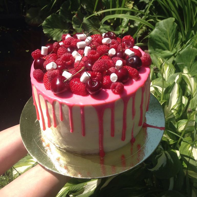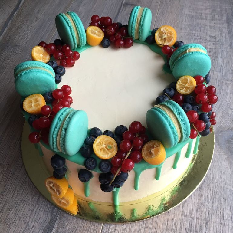 Тортик для подруги на день рождения: миндальный бисквит, компоте из черной смородины и крем из сливок, маскарпоне и творожного сыра, выровнен крем чизом.