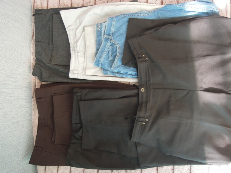 Брюки в основном классика:пара черных,коричневые,светло серые,темн.серые и джинсовые бриджи.НА РОСТ 166 ПРИМЕРНО. ЭКВ от 400-500