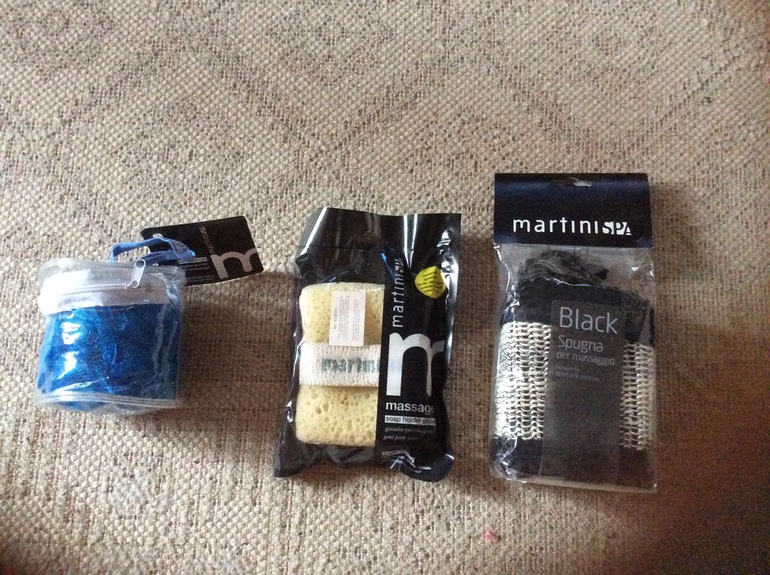 Мочалки и губка для мытья тела. Martini spa. Производство Италия. Слева направо Экв 150, 200, 450 рубл