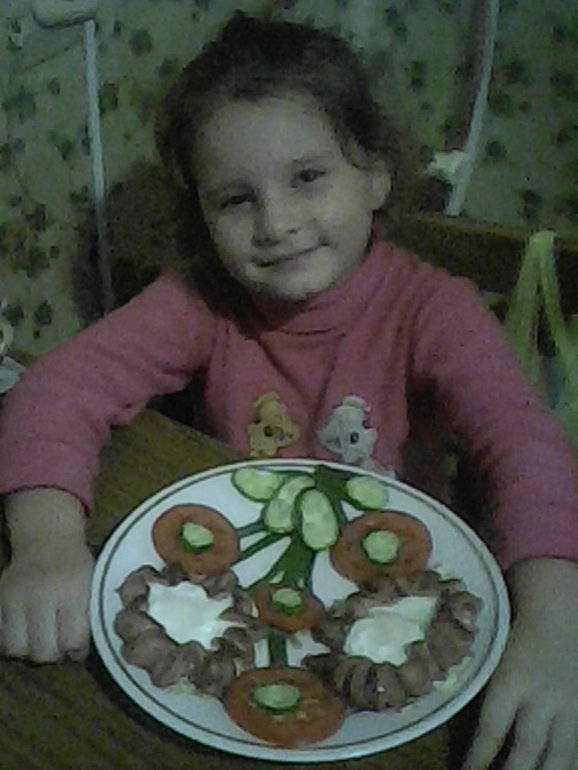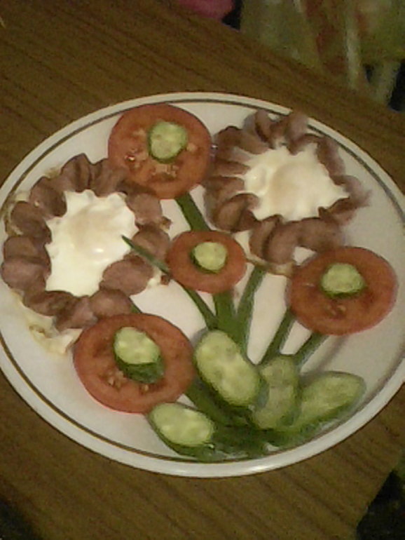 Дочка плохо ест - приходится изобретать что-то новенькое. Вот что у меня сегодня получилось из 2х яиц и 2х сосисок 1\2 помидора и 1\2 огурчика.