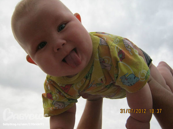 Среди чужих - сама серьёзность, как ни старайся - ни улыбнётся, ни агукнет... Но зато среди своих очень общительный, улыбчивый. Постоянно что то лопочет на своём ктитайском) Радуется когда меня увидит. Любит кусать меня за подбородок и таскать за волосы, скоро буду лысой... Рекламу по телеку обожает, особенно "Моджо-моджо", где японочки танцуют, смеётся, аж закатывается)))