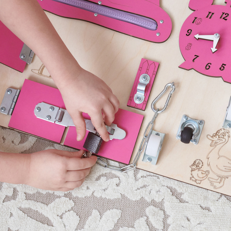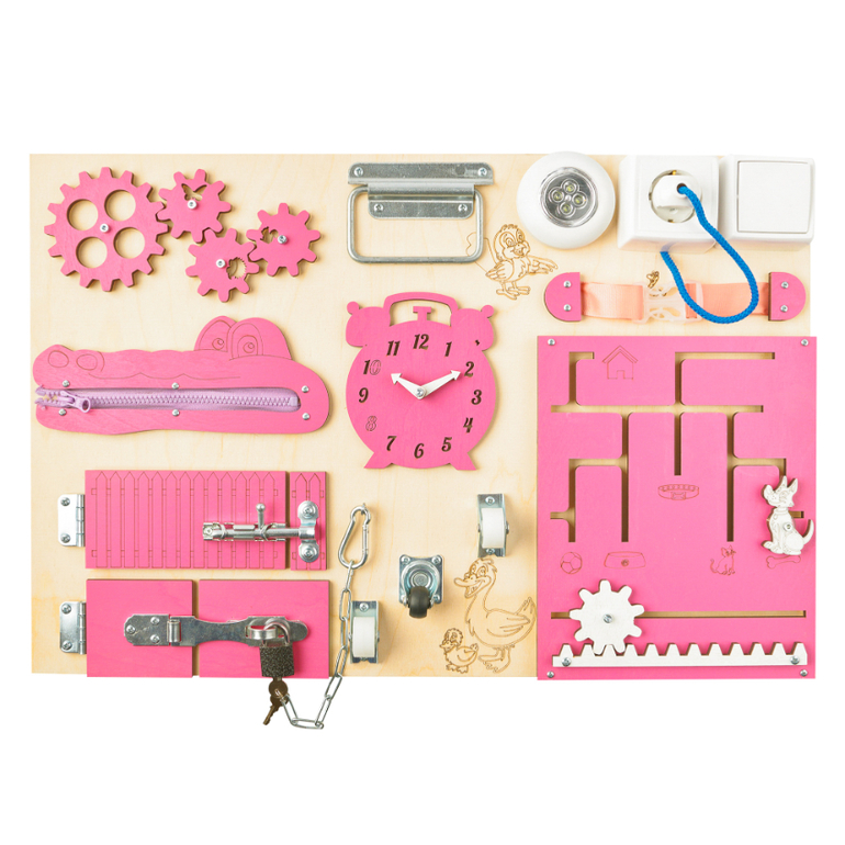Бизиборд поможет Вашему малышу в развитии мелкой моторики, внимания и логики. Также даст Вам пару свободных часов в день, пока малыш будет играть. Бизиборд имеет 14 различных элементов для игры. Мы изготавливаем бизиборды трех расцветок, смотрите фото. Также мы делаем бизиборды на заказ, например, если Вам не понравилась расцветка элементов или их конфигурация, то мы сделаем игрушку по Вашему желанию. Мы сами производим игрушки в России из березовой фанеры и красим краской на водной основе (специальная краска для детских деревянных игрушек, которая имеет Европейский сертификат EN71). Также бизидом легко разбирается и собирается за несколько минут, это позволит сэкономить на доставке и компактно хранить игрушку. Элементы бизиборда: