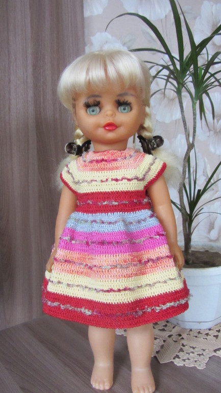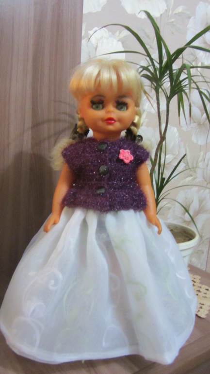 ВязаниеПохвасталась на работе кукольными одежками))) И одна девушка принесла мне свою красавицу советских времен)))) Скажу честно кукла мне не понравилась((, Блондинка, и никак не могла я ей подобрать цвета. Ну все-таки связала кофточку и пошила юбку. И платье связала, вот платье мне понравилось и вязать и ей как мне кажется идет. Позвонила заказчице, все, после выходных принесу. А грызет меня что не доделана юбка. Связала шнурок и пришила по низу юбки и кофточке край обшила.Вот: