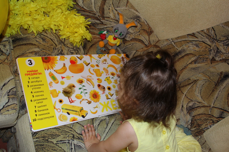 Утро мы начали с просмотра обучающего ролика про желтый цвет, смотрели его раз 5, по Настиному требованию, на большее у меня терпения не хватило, и я переключила ее на фото и картинки на желтую тему.