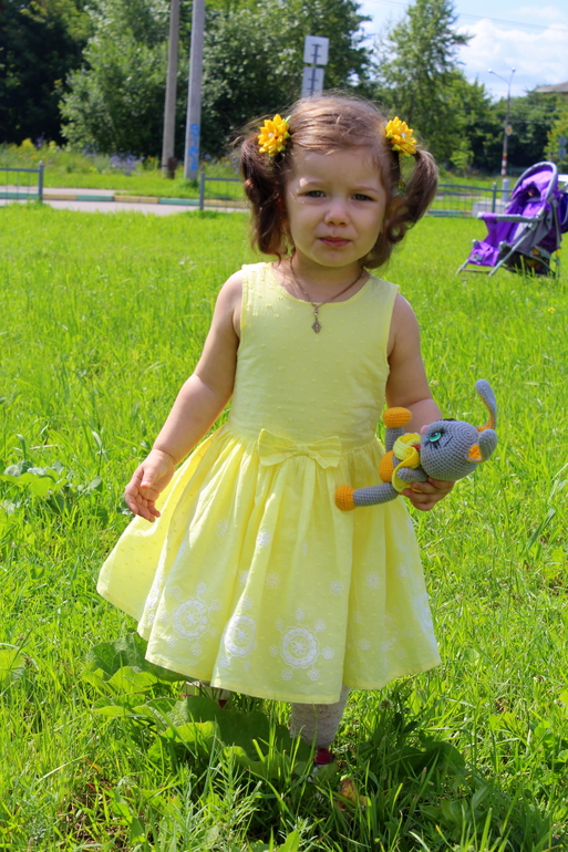 решили прогуляться с самого утра и поискать на улице желтые дома, машины и т.д. Взяли любимую зайчиху в желтом платье и отправились в путь.