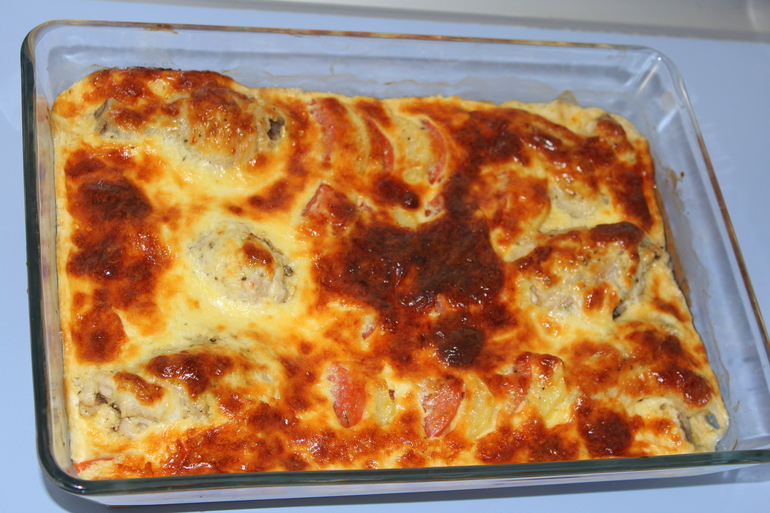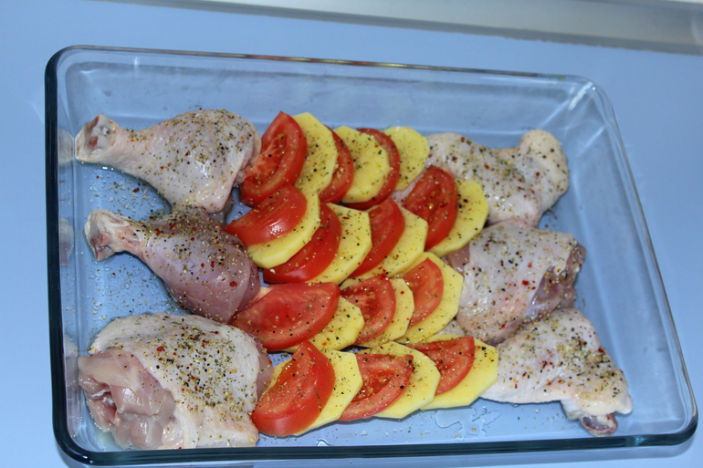 Когда рыбка закончилась, я купила курочку. Грудка - для меня, так как я сейчас худею))) Спинка на супчик пошла, а крылышки и ножки запекла в духовке под той же шубкой, что и рыбку. Еще и картошечку с томатом положила. Дети ели, только брызги летели)))