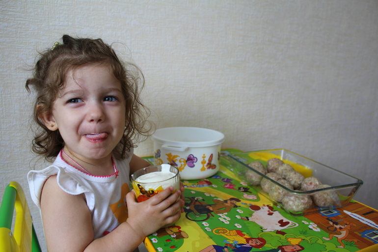 Колобков налепили, принялись за соус. Дала Настене стакан сметаны, ее нужно было вылить в кастрюльку, но дочурка решила сначала отведать ее))) а распробовав отказалась от дальнейшего участия в приготовлении обеда)) натрескалась сметаны и пошла играть)))