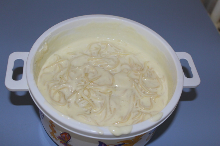 1) Отвариваем вермишель до готовности, сливаем воду, добавляем сливочное масло, ванильный сахар, сахарный песок (по сладости ориентируйтесь на свой вкус) и хорошо перемешиваем. Даем остыть до комнатной температуры. Отдельно взбиваем яйца,перемешиваем с творогом и добавляем их в остывшую вермишель, перемешиваем.