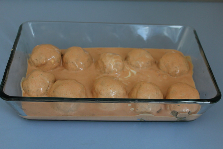 Накатайте колобков, и залейте соусом: 1/2 стакана воды, 1/2 кетчупа ( я добавила 70гр томатной пасты) и стакан сметаны.
