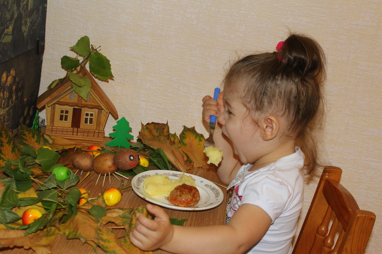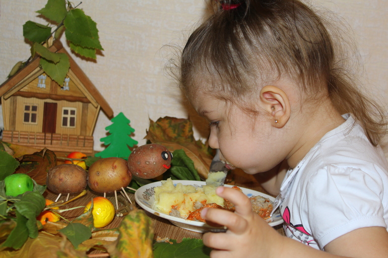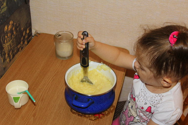 А тут и картошечка подоспела! Немного опасалась я того, что кастрюлька горячая. Предупредила Настену, она прекрасно понимает, что такое горячо и холодно и была осторожна. Положила приготовленное маслице, с моей подстраховкой налила молочка и стали мять картошечку, сначала вместе, а потом дочурка сказала свое любимое "Я САМ!" и продолжила мять без меня... не знаю сколько времени это продолжалось, картошка уже стала остывать... я думала мы останемся без ужина))) пришло время принимать меры, нужно было отвлечь повариху от такого интересного занятия)