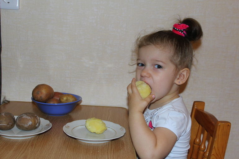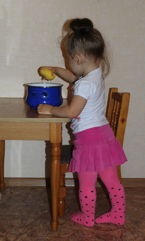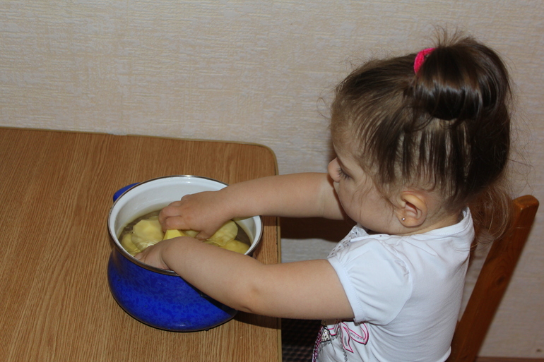 Поставила я перед ней два вида картошки - вареную и сырую. Трогали, сравнивали, искали отличия. Потом совместными усилиями почистили вареный картофель, а сырой я чистила сама. Настена взбунтовалась, ей хотелось и дальше вдвоем чистить картошку и тогда я налила в кастрюльку воды и дала ей задание - мыть очищенный картофель) Идея ей понравилась) Приступила к исполнению с большим энтузиазмом.