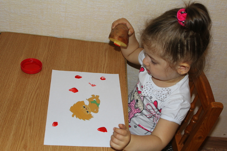 А потом было рисование. Раскрашивали Антошку с его картошкой и штамповали штампом из картошки)))) Так как руки у меня растут ..... не оттуда откуда им положено, ничего лучше ромба я вырезать не смогла