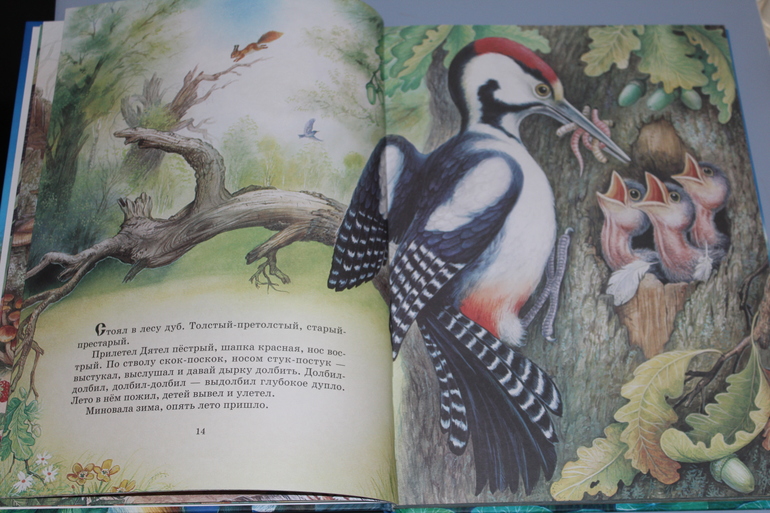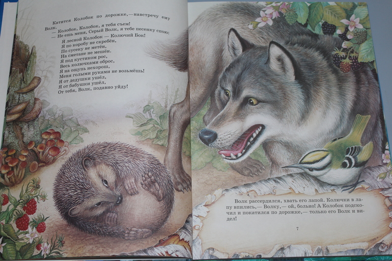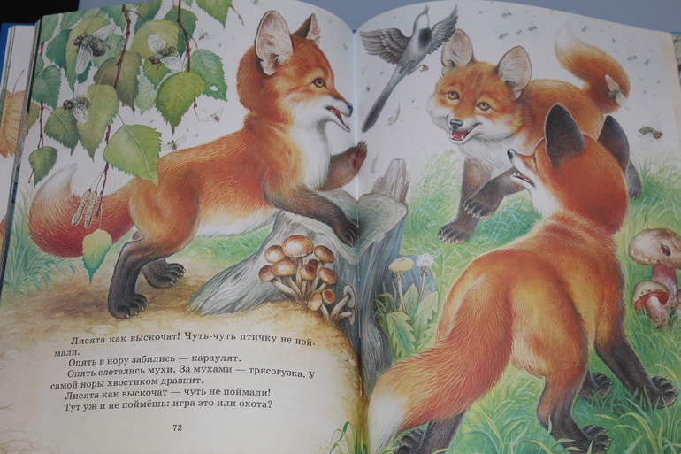 К сожалению я не помню кто из сообщников рассказал про книгу Бианки Лучшие сказки о природе, но я очень благодарна этому человеку! Книга просто клад! Время было уже 12 ночи, а мы снова и снова читали про колючего колобка)))))) Очень реалистично изображены животные, иллюстрации почти все на весь разворот, а текста по чуть-чуть написано, отлично подходит на наш возраст! Единственный незначительный минус в обложке. На название и листики от ягод нанесен клей с блестками. Для чего не понятно... С названия клей стал осыпаться сразу, так что я книгу просто отряхнула от него и как не было... а на листиках ягод держится... Но это совсем мелочь...