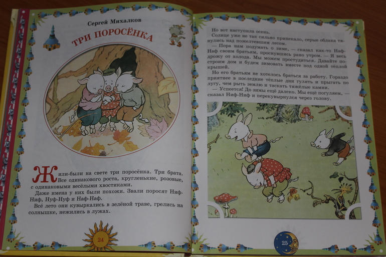 Сказки любим читать все в той же страшненькой книжечке, доставшейся по наследству от брата. Например, сказка про трех поросят у нас есть в нескольких вариантах, но дочка любит именно в этой книге с бледными иллюстрациями. Так же, в этой книге, читаем сказку про храброго зайца и про трех медведей.