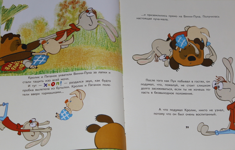 От него у меня уже язык на боку и весь в мозолях. Поселился он у нас давным - давно, кажется в прошлую пятницу примерно год назад и был сразу залюблен, тогда ещё полуторагодовалой, дочкой. Но так как сейчас мы его, конечно, не читали. Больше рассматривали иллюстрации, смеялись как Пух ныряет в лужу, как падает с дерева, пели "Пуховы" песенки... Сейчас всё серьёзно! Читаем за один присест всю книгу. С несколькими перерывами секунд на тридцать. Происходит это так. Дочка встает со словами: " Мамочка, я пошла молочко попью, а ты без меня не читай!" Строгий взгляд и грозит мне пальчиком. Я обещаю слушаться, дочка быстренько пьет и мы продолжаем. В следующий раз встает: "Мамочка, я пошла чайку попью, а то он у меня уже остыл, а ты без меня не читай, картинки не смотри и книгу не закрывай!", обещаю ни чего этого не делать. Третий наш перерыв - встаёт, серьёзно смотрит мне в глаза, молча подносит палец к губам. Я киваю. Бежит, пьет и обратно ко мне под бочок.