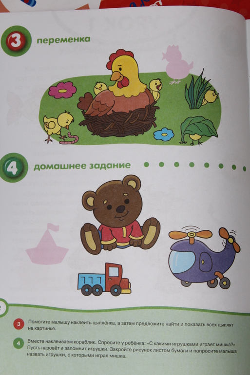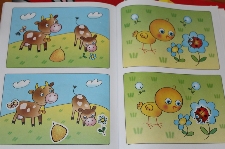 Я планировала проходить по одному заданию из каждой тетради в день. Но Настёна решила по другому. "Развиваем внимание" она прошла в за два раза. В этой тетради на каждой странице по два почти одинаковых изображения. Нужно найти чего не хватает на нижней картинке и наклеить наклейку, что бы стало всё одинаково.