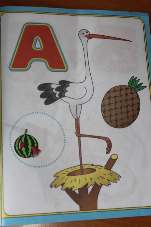 А вот тетрадь Учим буквы можно пропустить. Ничему она не учит, как мне показалось. На странице написана буква и рисунок на эту букву. Ребёнку нужно найти наклейку, название которой начинается на эту букву, и приклеить её на страничку. Получается, что ребёнок уже должен знать все буквы.