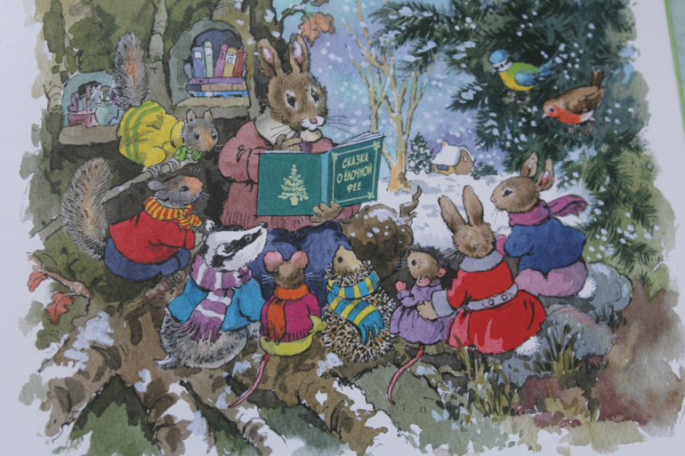 В книге пять небольших рассказов про девочку Таню. Как она радовалась снегу, как лепила с подружкой снеговика, как ездила с дедушкой в лес, за ёлкой, как трудно было украсить эту самую ёлку (у моей вопросов не возникло, почему в Таниной семье не было игрушек и гирлянд для ёлки, а вот деткам постарше можно будет объяснить, как тяжело жилось людям после войны, и новогодние игрушки были настоящей роскошью), ну и последний рассказ про то, как Танюша ждала Новый год, все бегала на крыльцо его встречала) Нам книжечка понравилась.