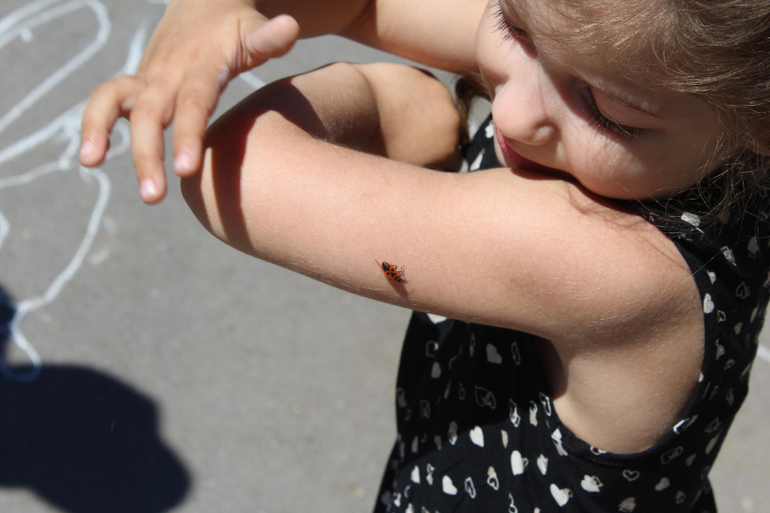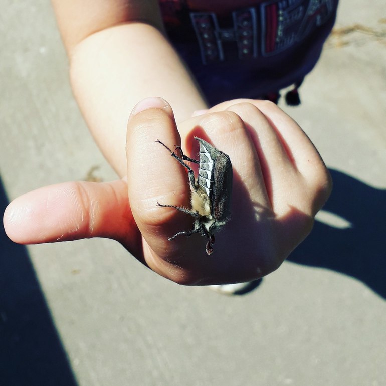 Настя всех берёт в руки, будь то лягушки, или кузнечики, дождевые черви, букашки, таракашки, любого, кого сможет поймать, будет рассматривать, смеяться, что букашка щекочет её лапками, изумляться красоте "личика" у гусеницы... В прошлом году её укусила гусеница. Из книги дочка узнала, что та её не укусила, а ужалила своими ядовитыми волосками. И клоп солдатик, или в простонародье жук-пожарник, которых Настя собирает чуть не горстями, тоже ядовитый!