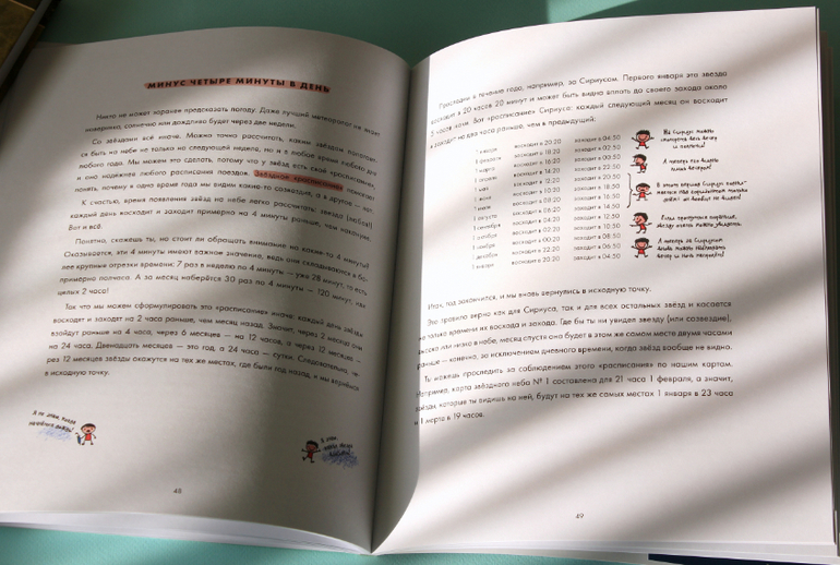 Настёна любит сидеть с книжкой на диванчике, водить пальчиком по звездочкам, составляя созвездия... Вот медведица раскинулась ковшом, а там, глядите, Орион пояс раскидал! И я уже понимаю, что с книгой она ни за что не расстанется, на подарок придётся покупать ещё один экземпляр.) У дочки больше веры в свои способности, она знает, что сможет ориентироваться по звёздам, не хуже чем пастухи в древности. Она запоминает названия планет и созвездий, ей всё интересно, она жаждет новых знаний. Ну что же, тогда вперёд! Книга приготовила нам много, очень много информации.