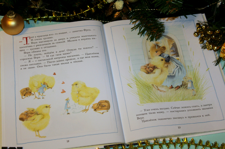 Теперь про минусы. Ну, во-первых, тема Рождества только в коротенькой первой истории, остальные рассказы к этому празднику отношения не имеют. Во-вторых, прежде чем читать эту книгу, нужно уже быть знакомой с мышкой Верой и ее друзьями. А в этом тексте часто упоминаются имена каких-то героев, про которых ранее не было ни слова, остается только догадываться кто они такие. Временами то ли текст корявый, то ли перевод. Приведу один пример. Звери шли в гости к кроту. Зайдя в нору, они увидели как с потолка свисают черви. Пчелка с отвращением отбросила букет, который несла кроту и "заторопилась обратно, на свой цветущий луг". Остальные отправились дальше, в поисках крота. Встреча с кротом прошла не очень радостно. И вдруг крот обращается к пчелке (которая давно улетела на луг?): "И вы тоже не принесли мне ни цветочка?" Пчёлка смутилась и начала оправдываться...